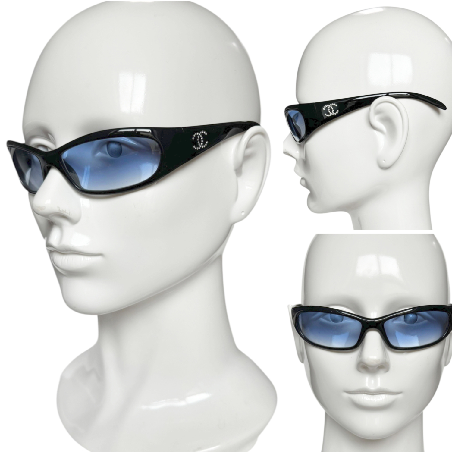 Chanel Diamante Logo Wraparound Sunglasses in Black / Blue