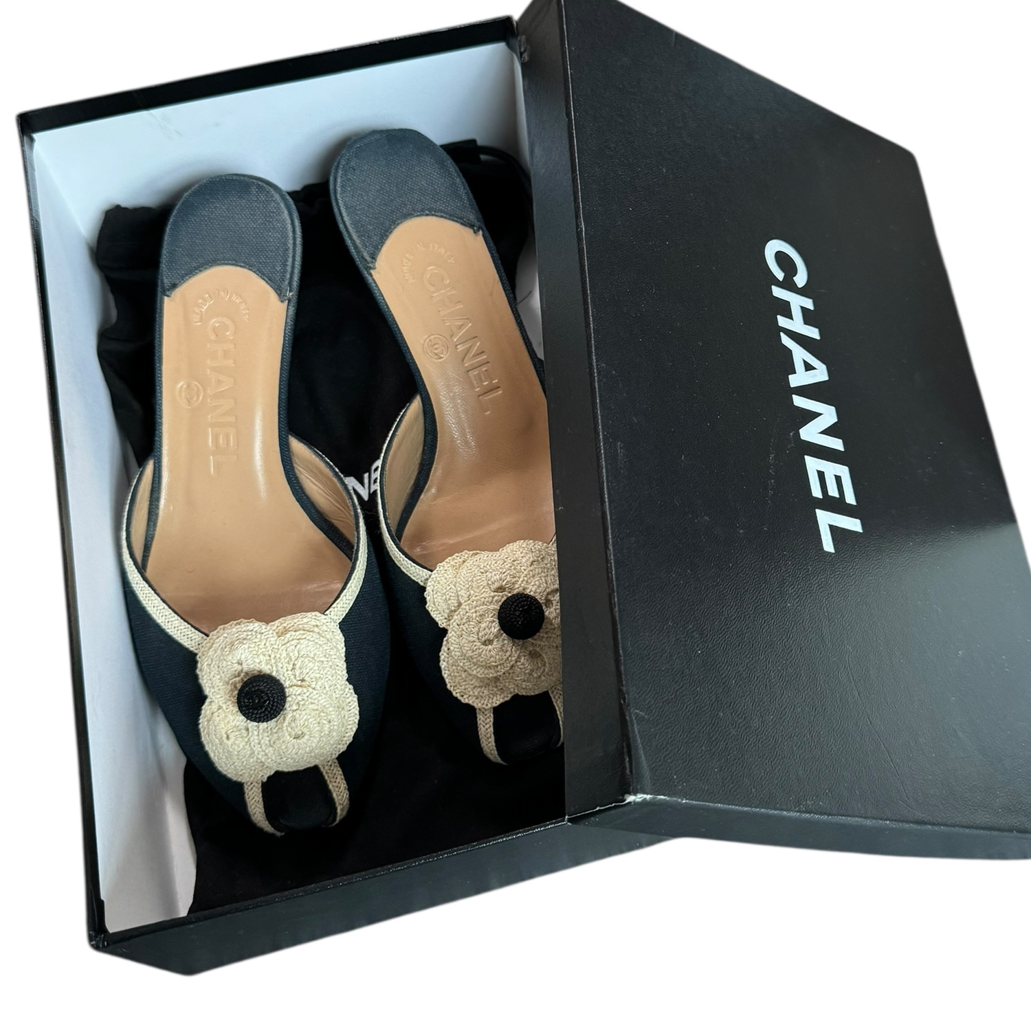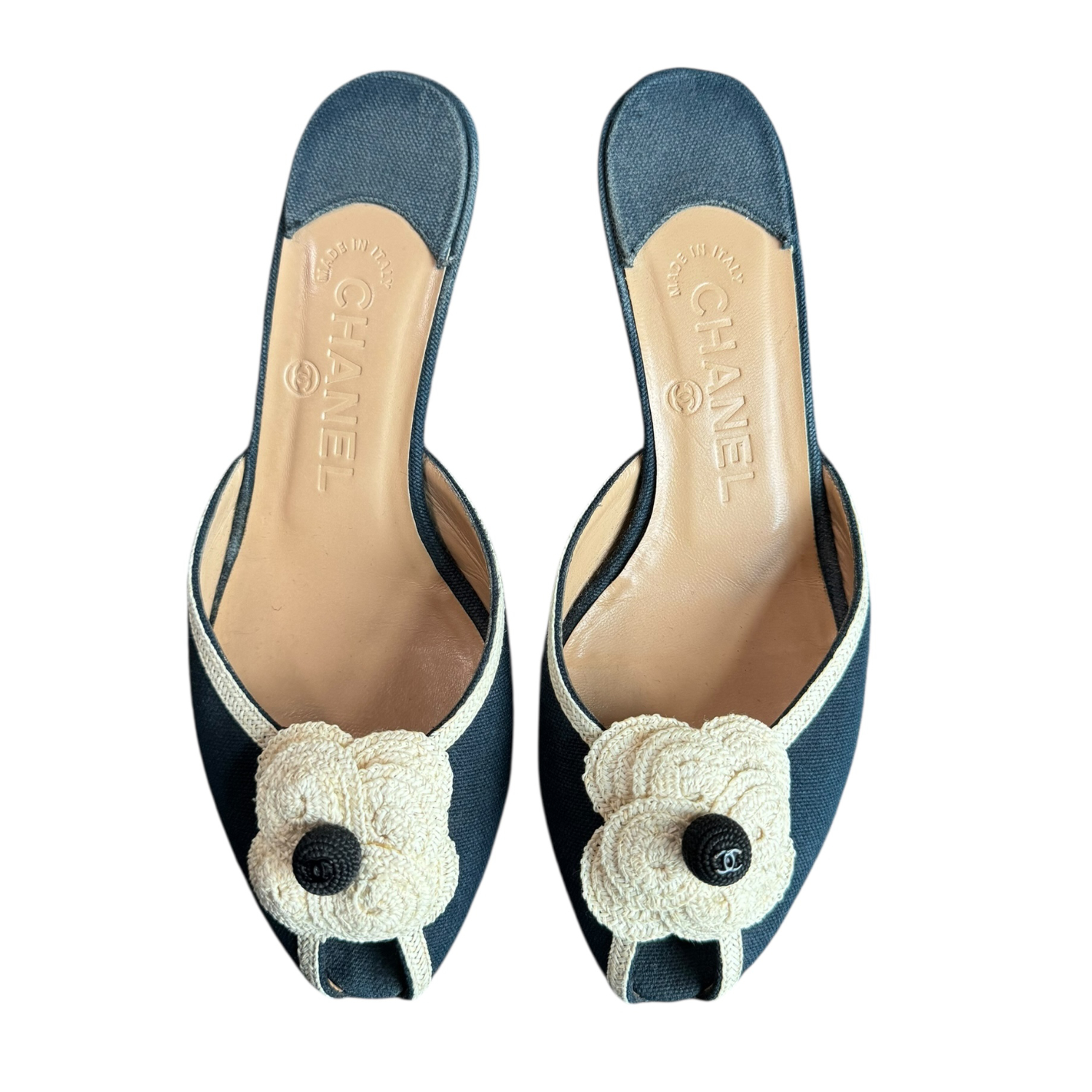 Chanel Logo Flower Linen Heels in Navy / Cream UK 3