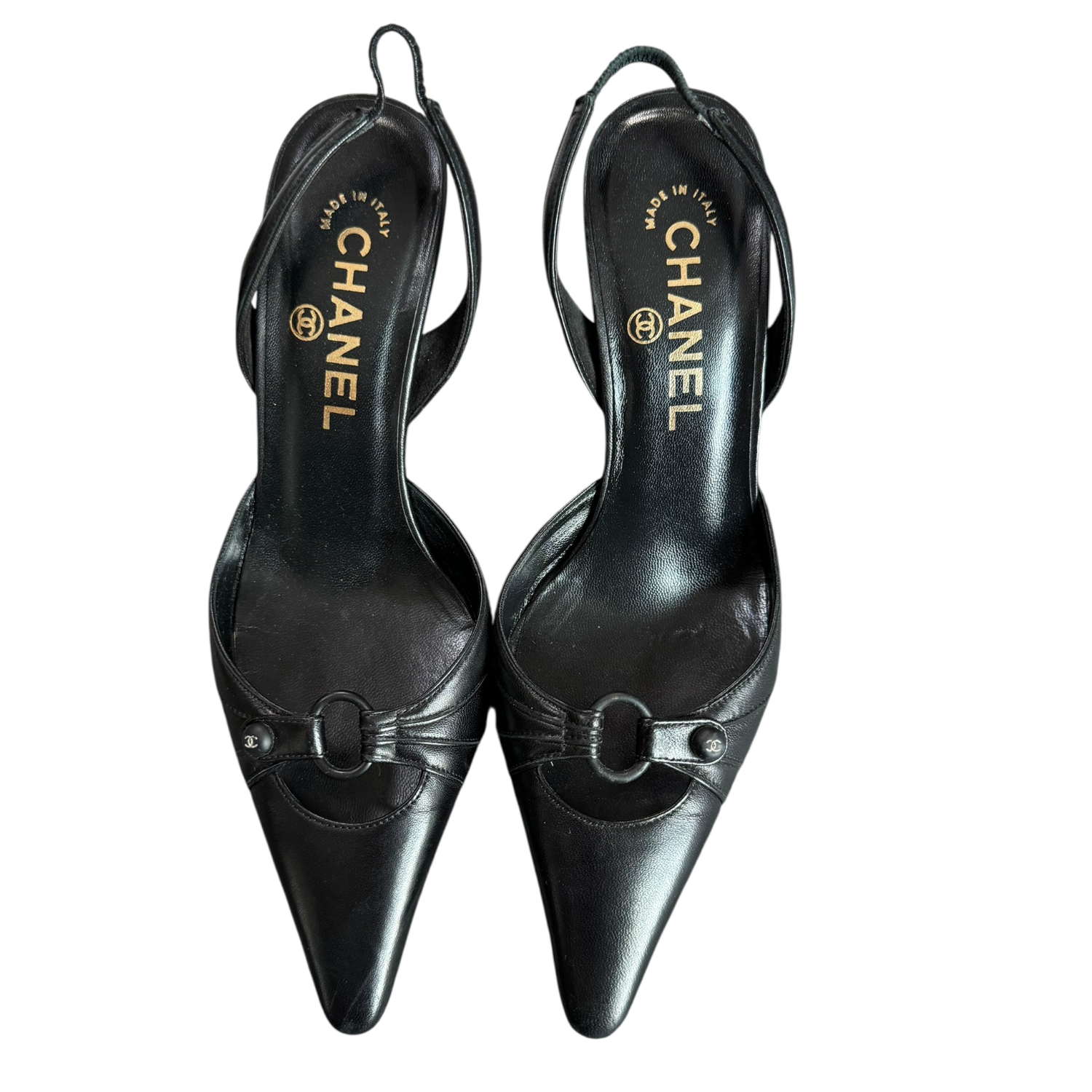 Chanel Logo Slingback Leather Heels in Black / Gold UK 3