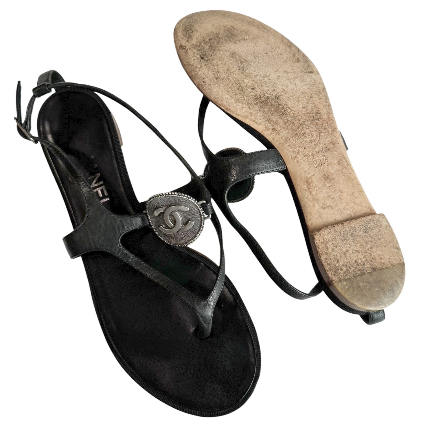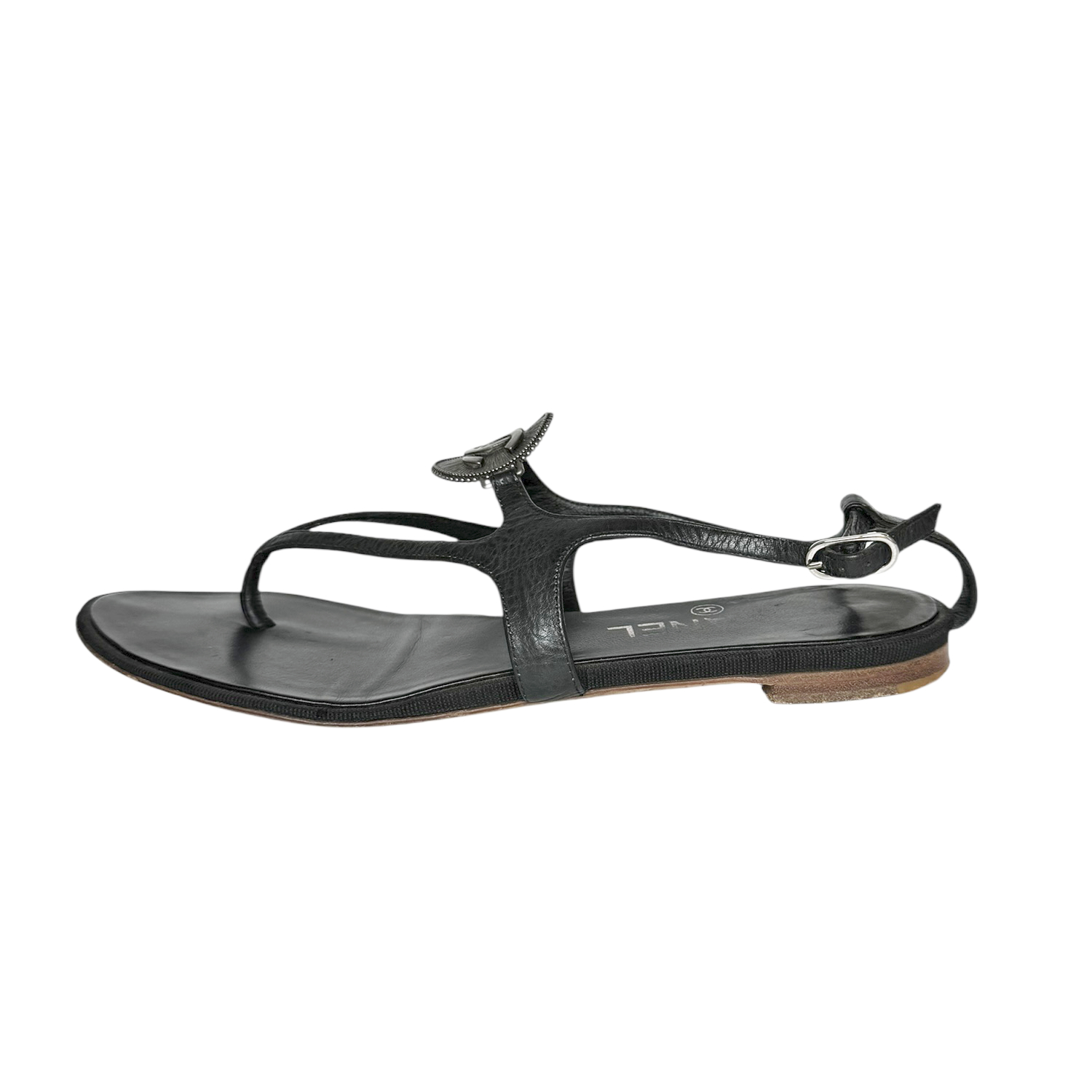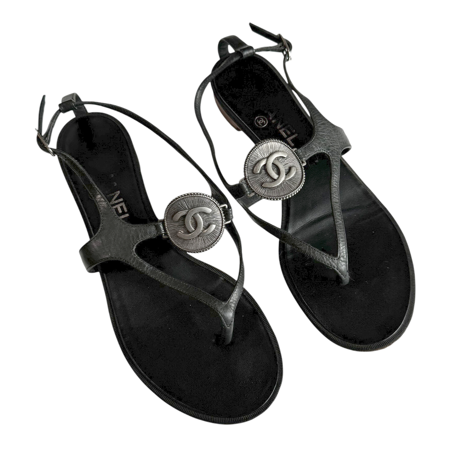 Chanel Logo Strappy Thong Sandals in Black / Silver UK 5.5