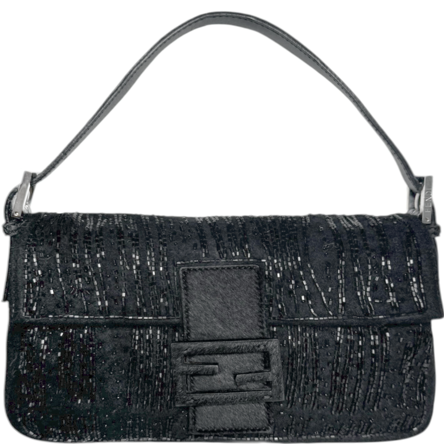 Fendi Beaded Felt Calfskin Shoulder Baguette Bag in Black / Silver