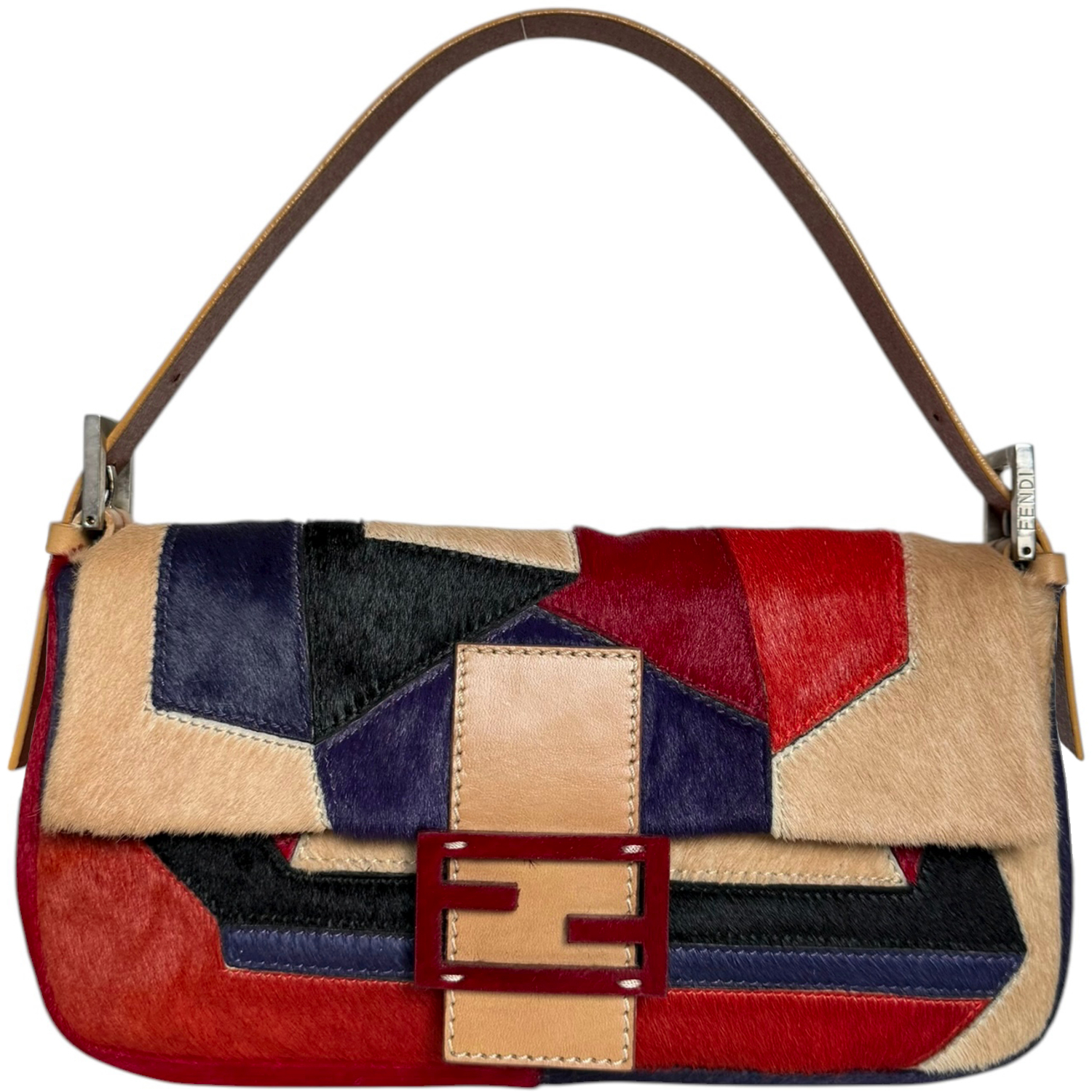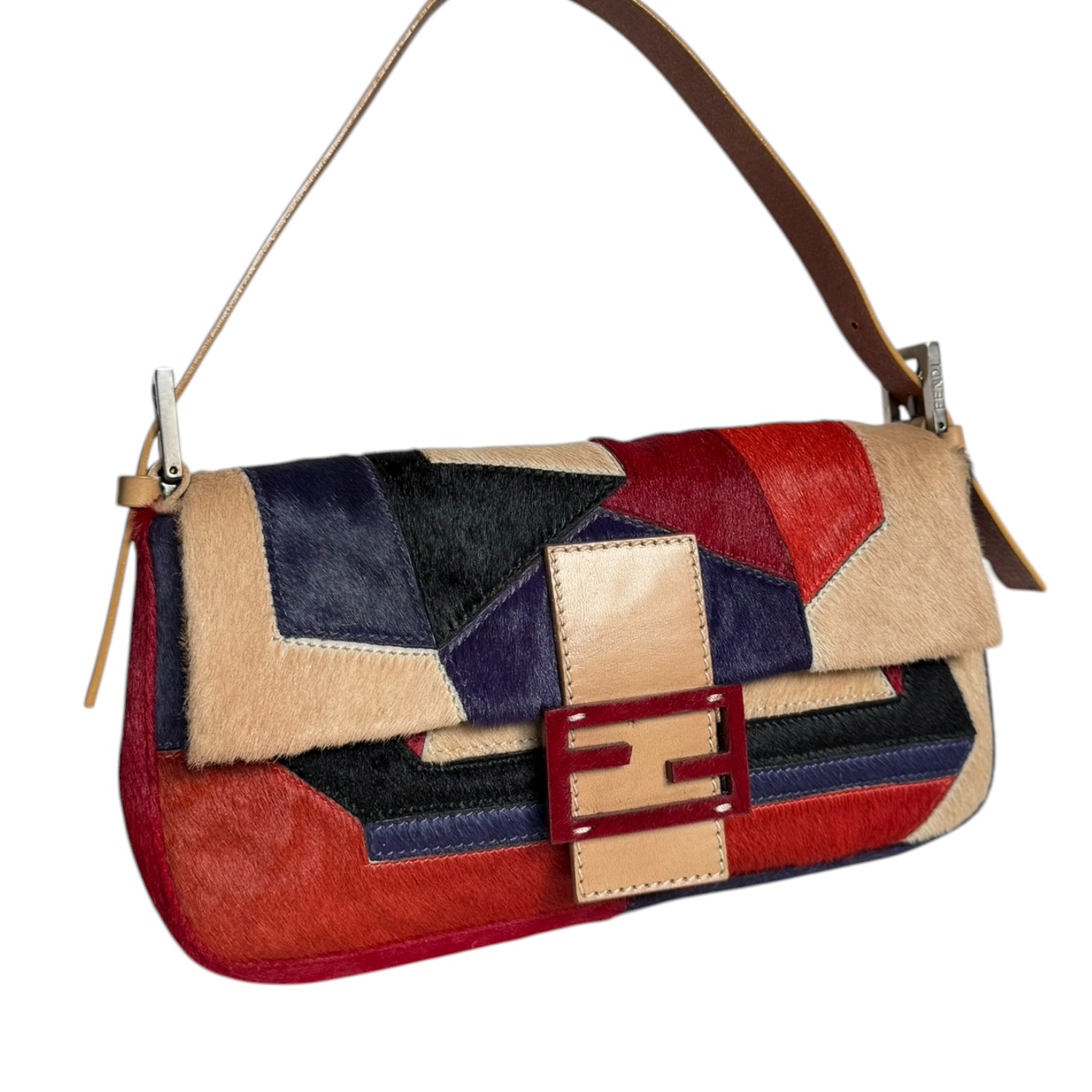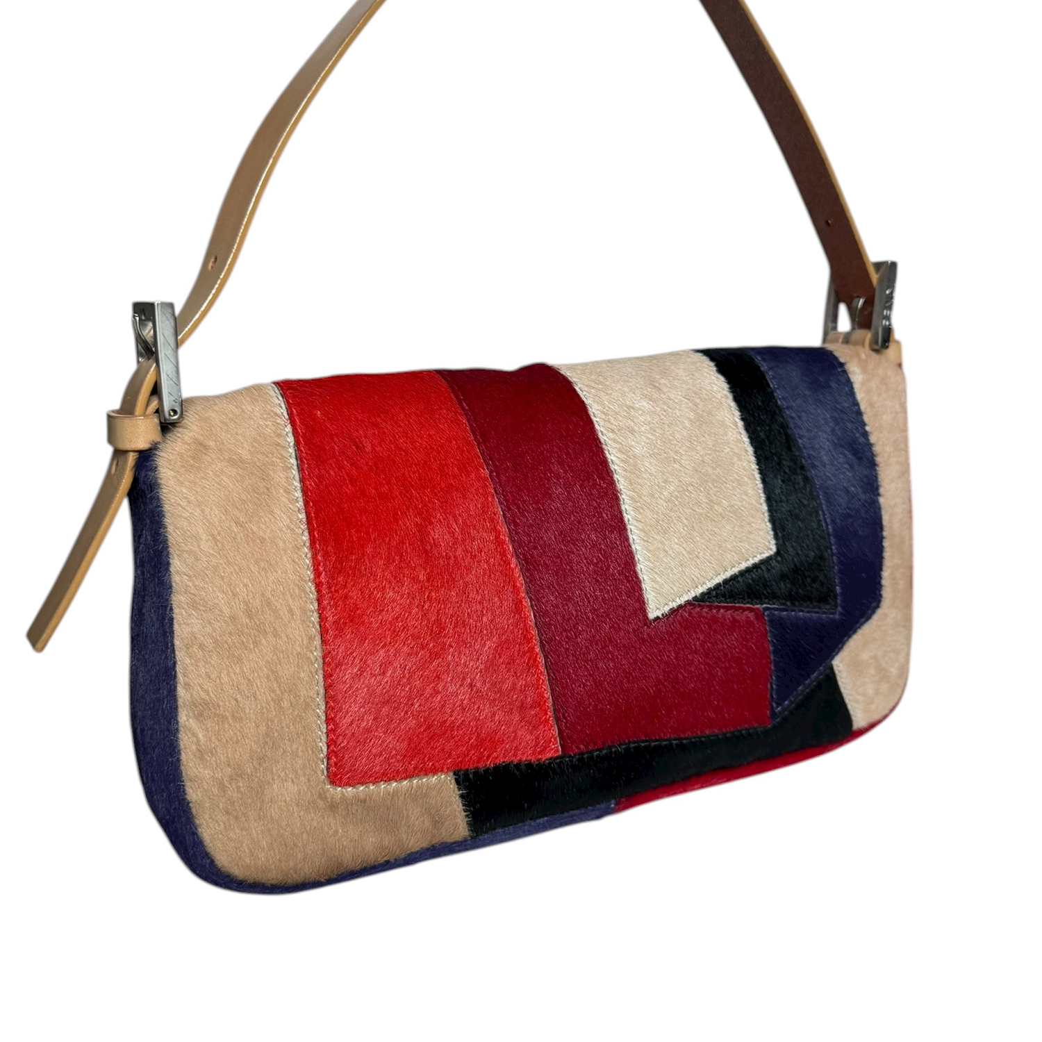 Fendi Calfskin Patchwork Shoulder Baguette Bag in Beige / Red / Multi