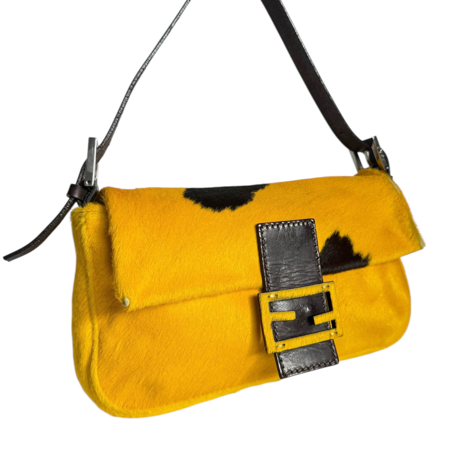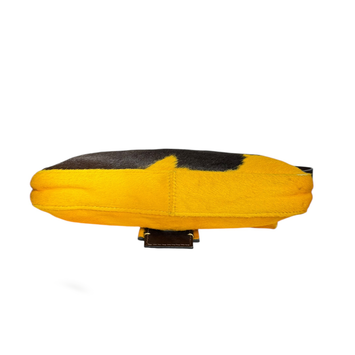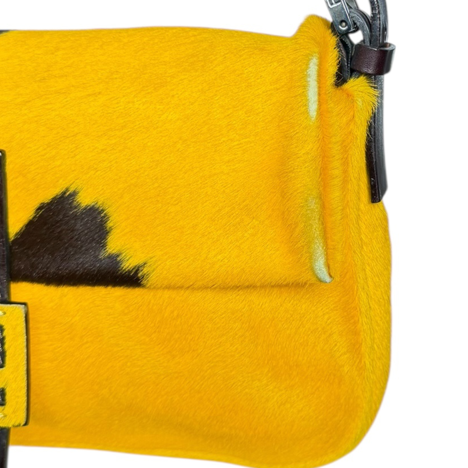 Fendi Cow Print Calfskin Shoulder Baguette Bag in Mustard Yellow / Brown / Silver