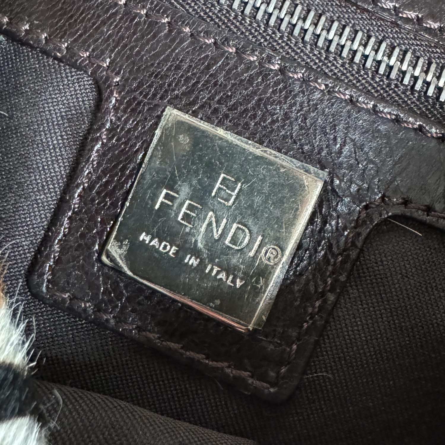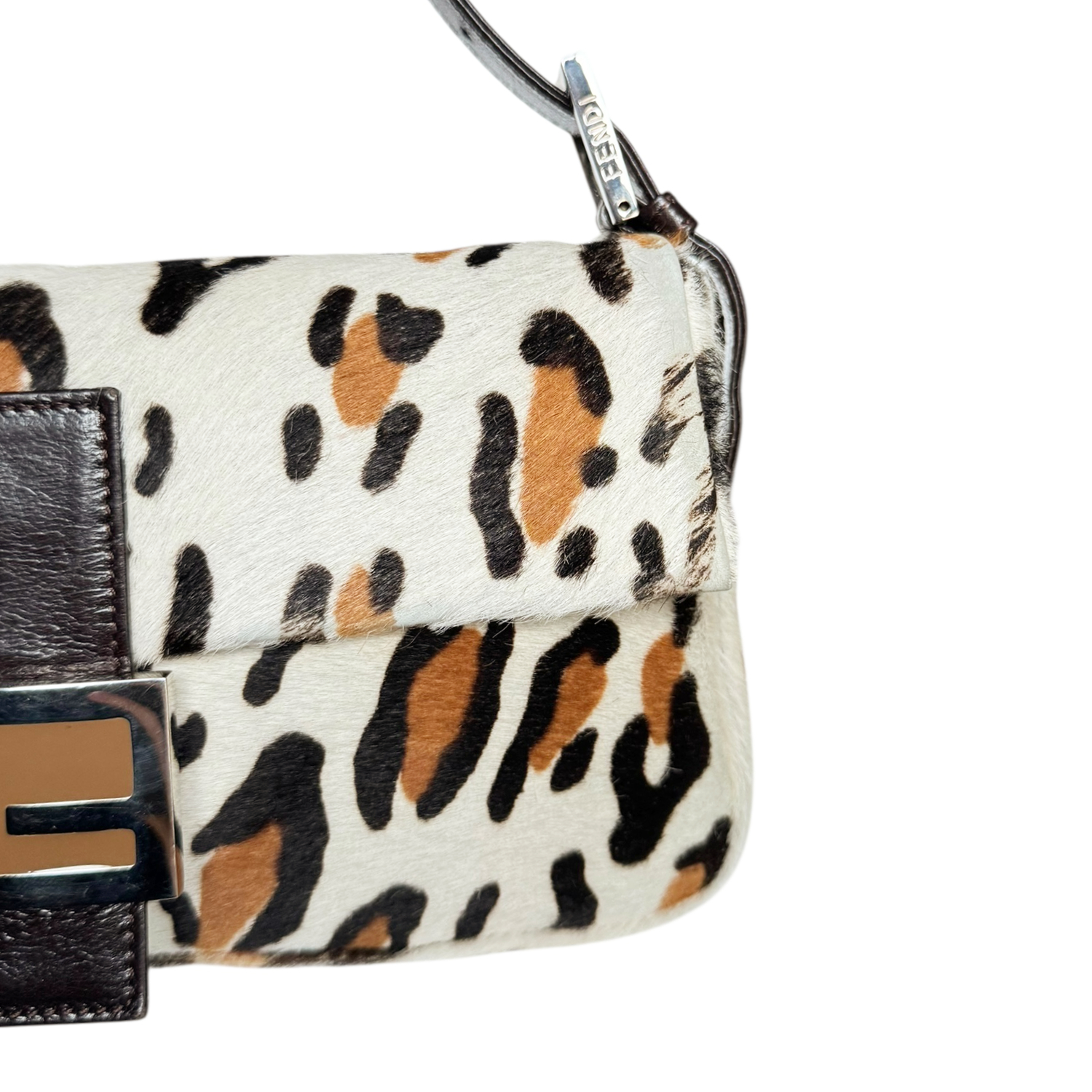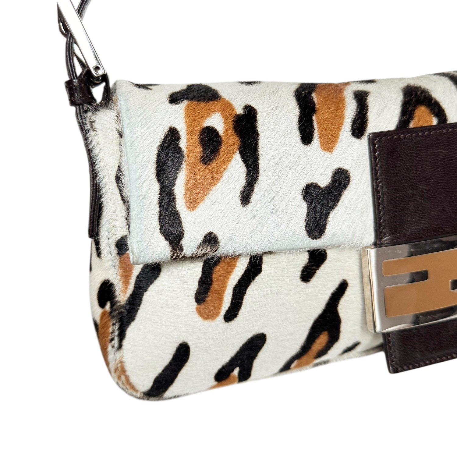 Fendi Snow Leopard Print Calfskin Shoulder Baguette Bag in White / Brown / Black