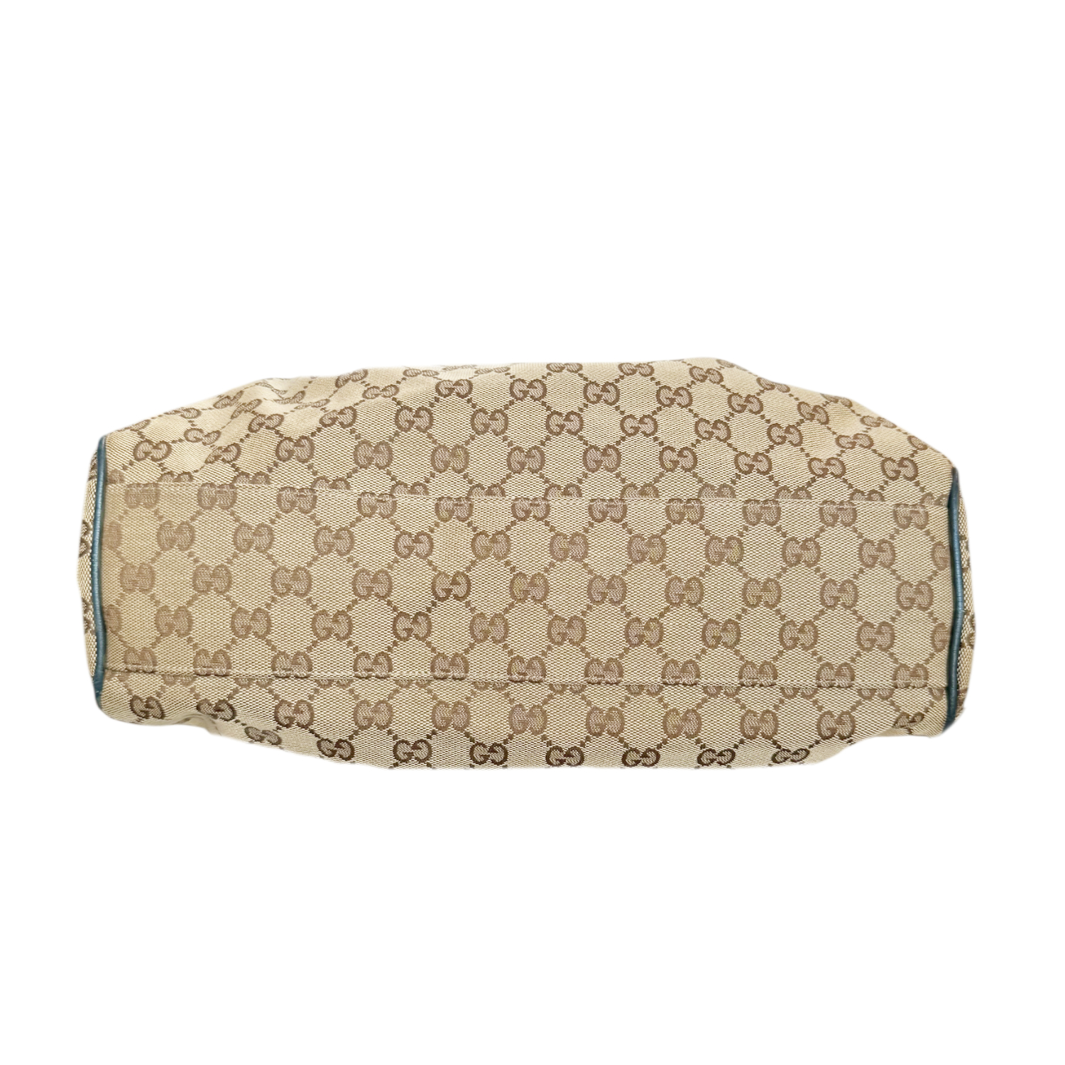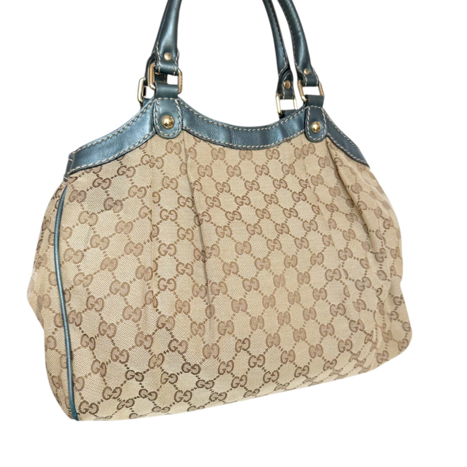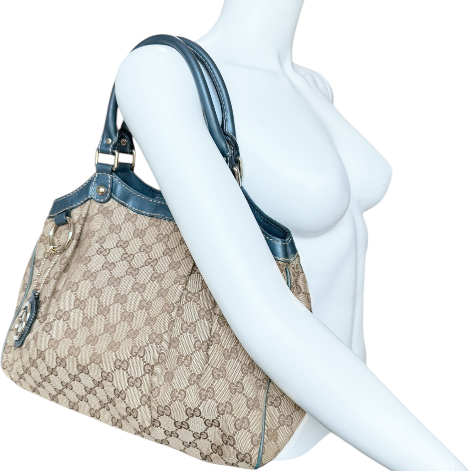 Gucci Monogram Sukey Hobo Shoulder Bag in Beige / Metallic Blue / Gold