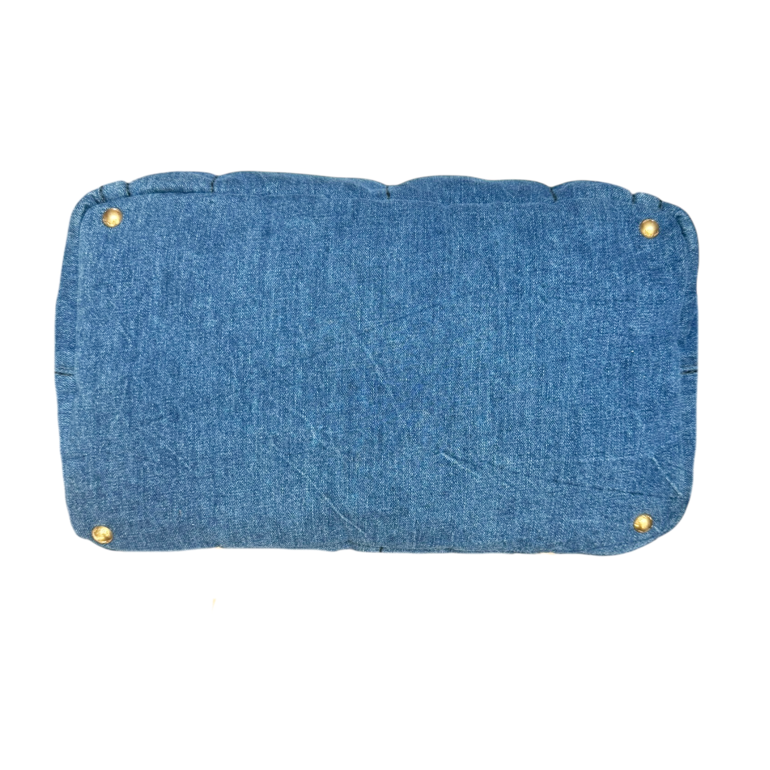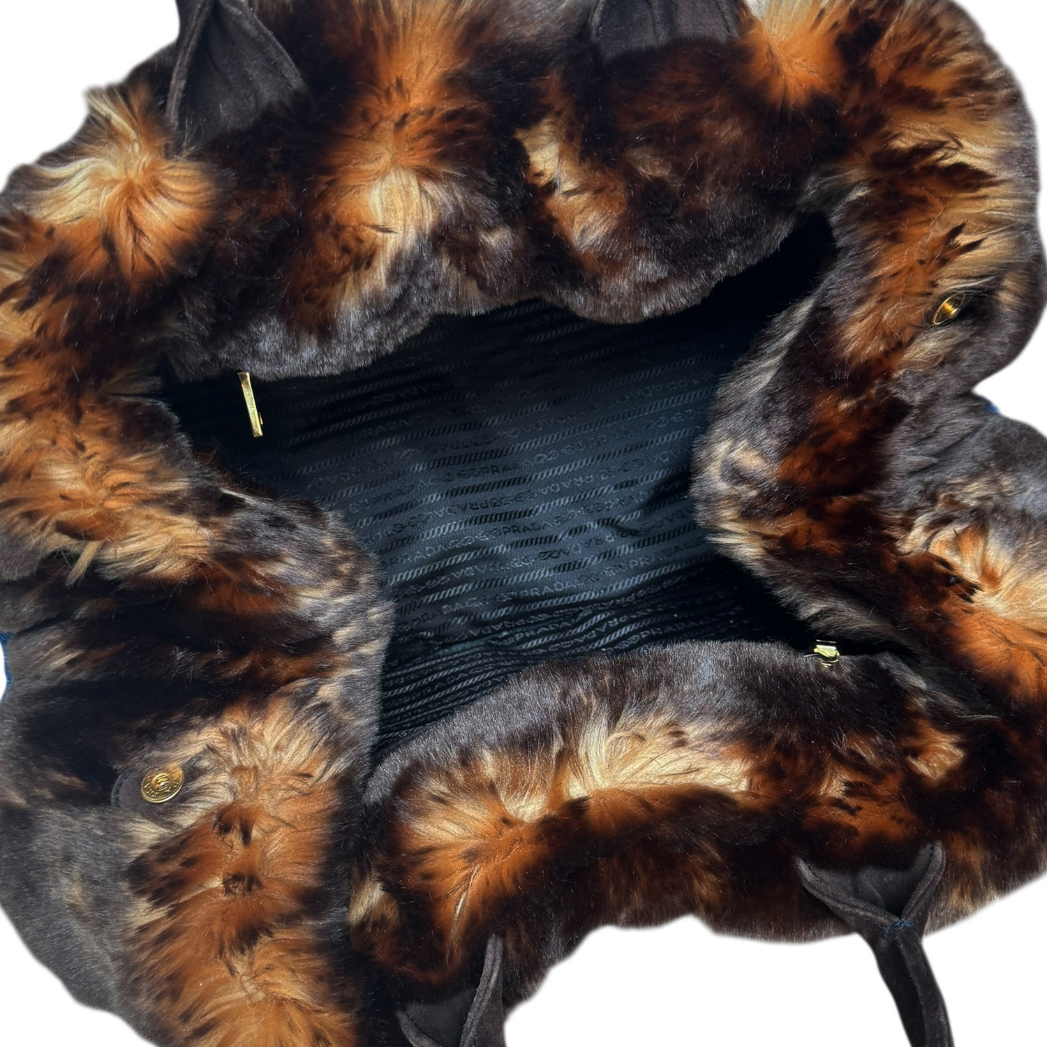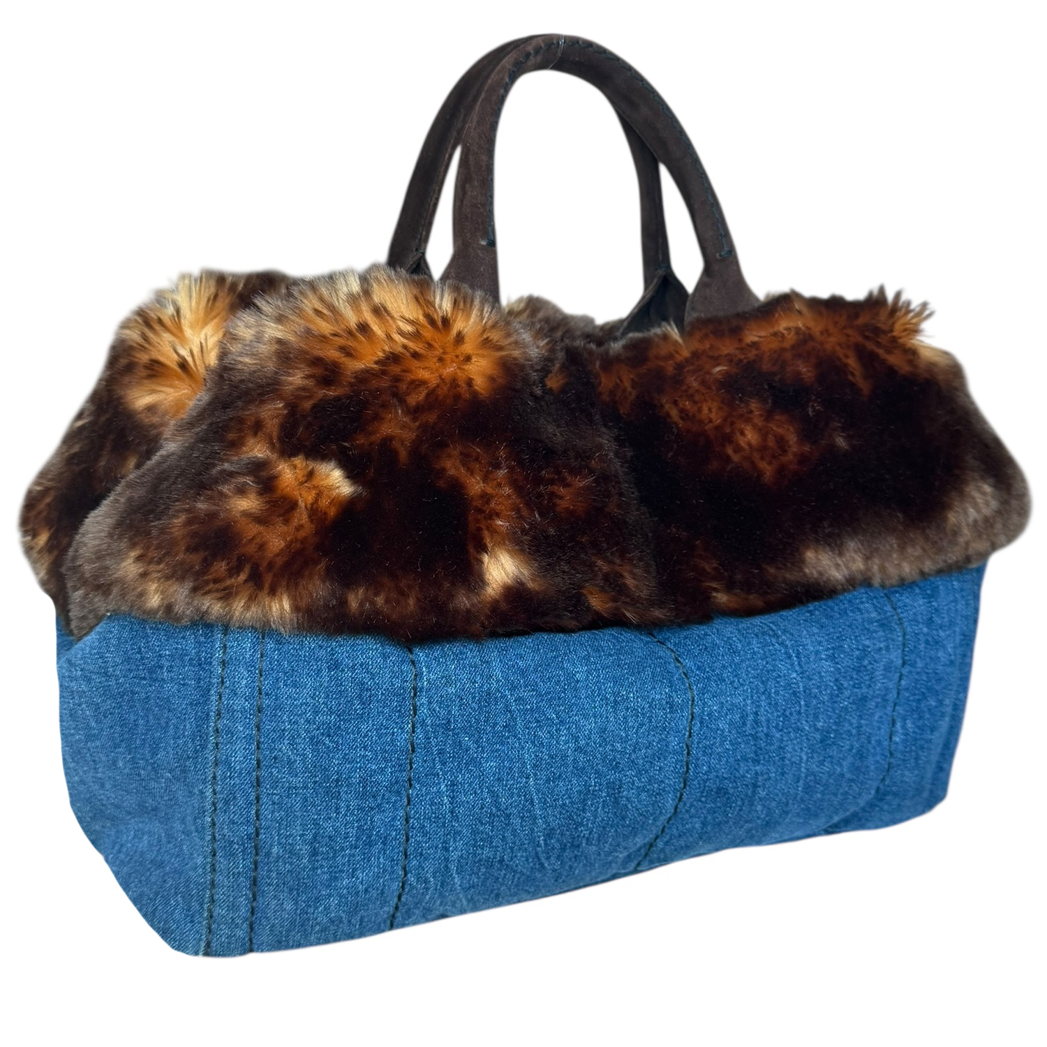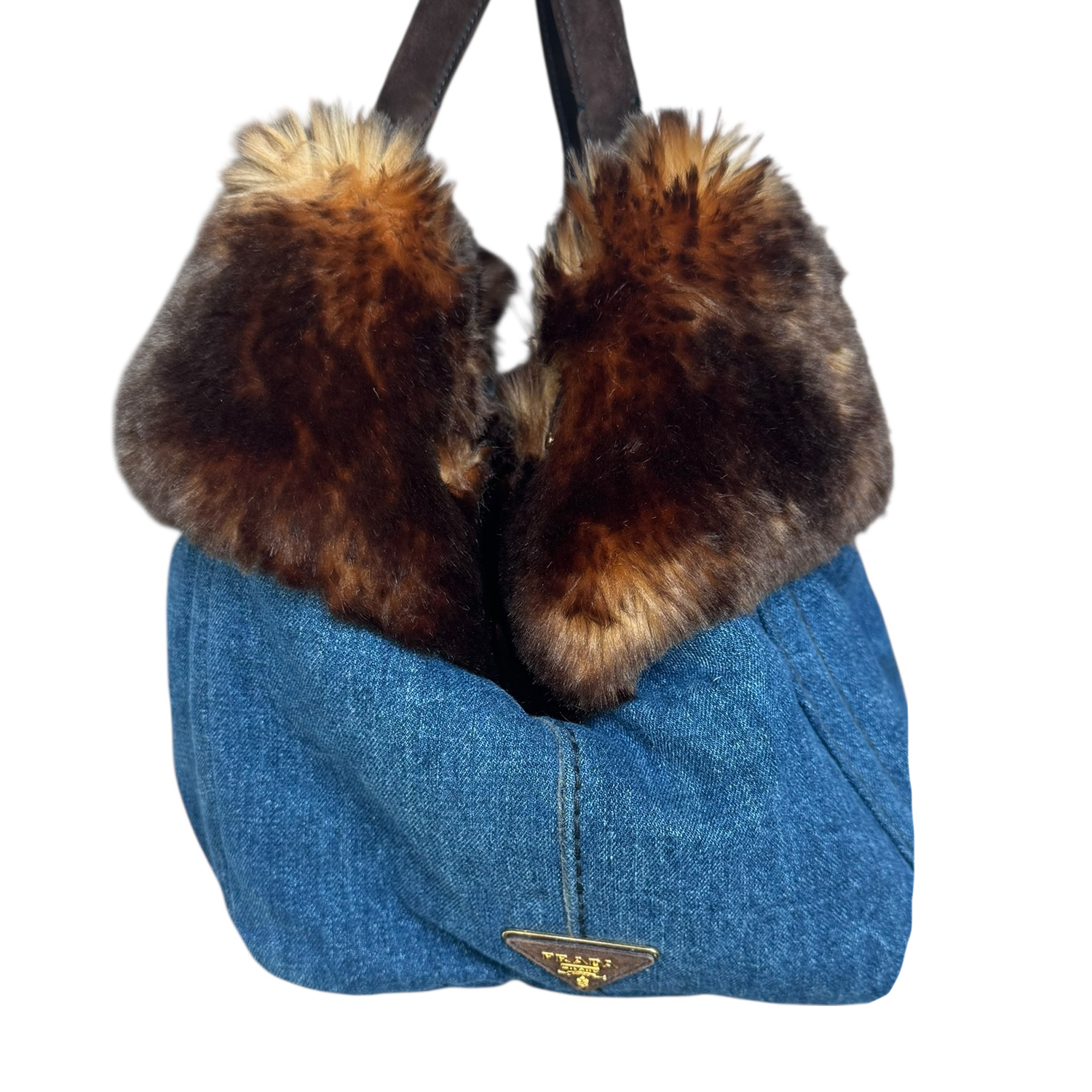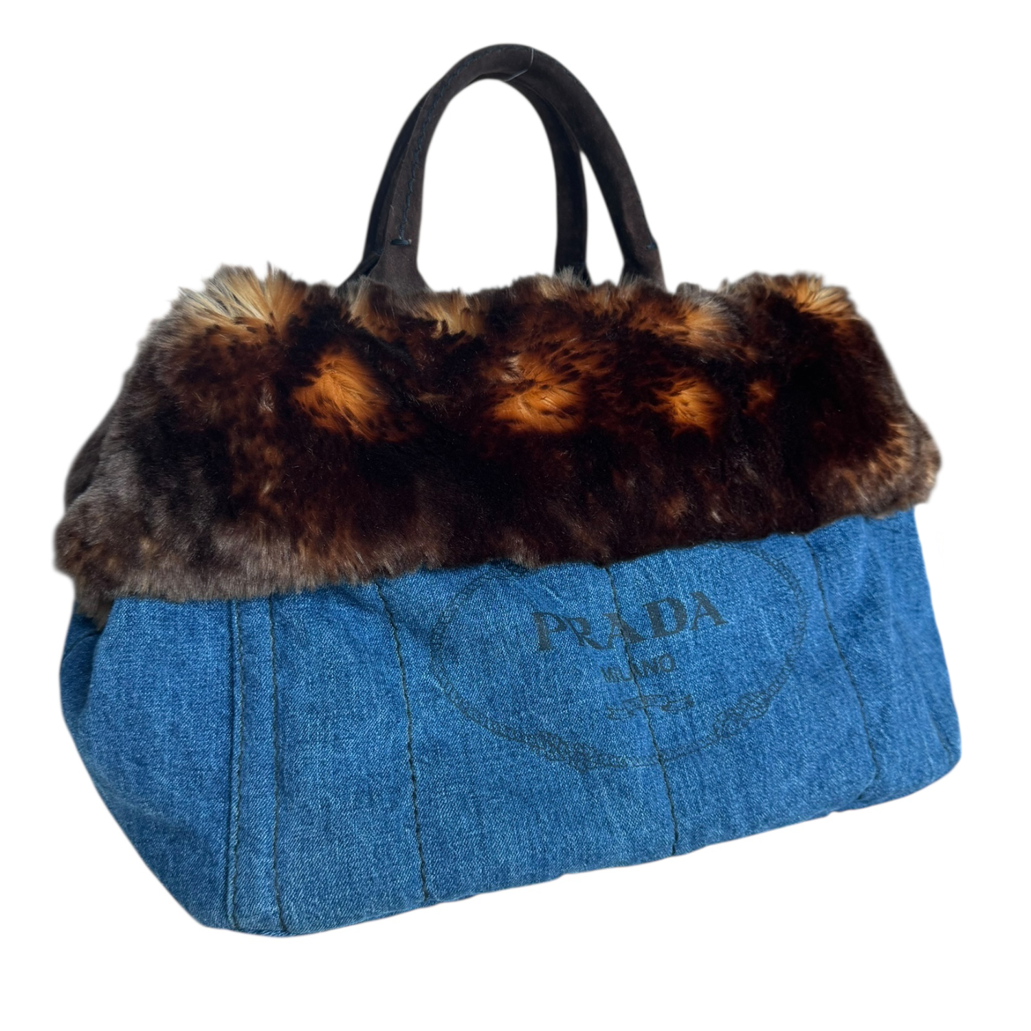 Prada Fur Trim Denim Canapa Tote Bag in Blue / Brown