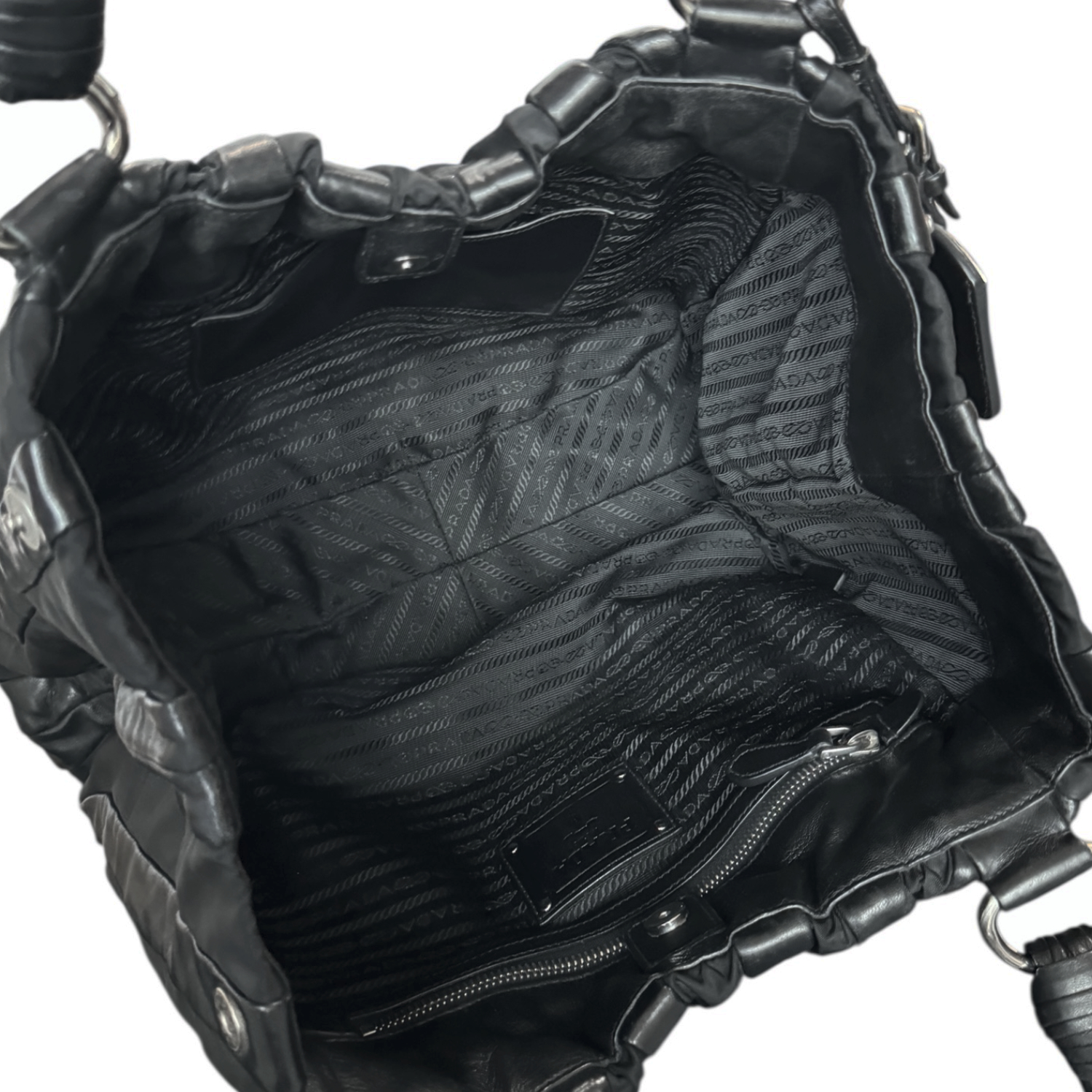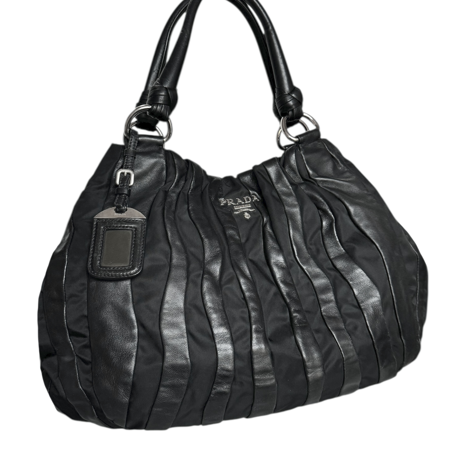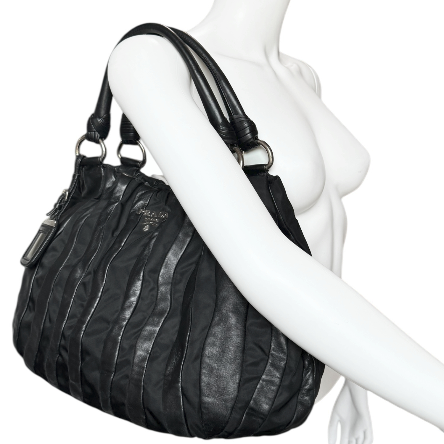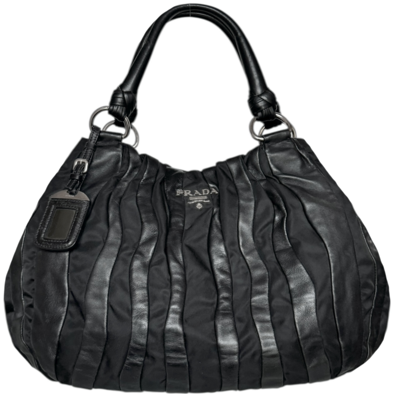 Prada Leather Nylon Striped Hobo Shoulder Bag in Black / Silver