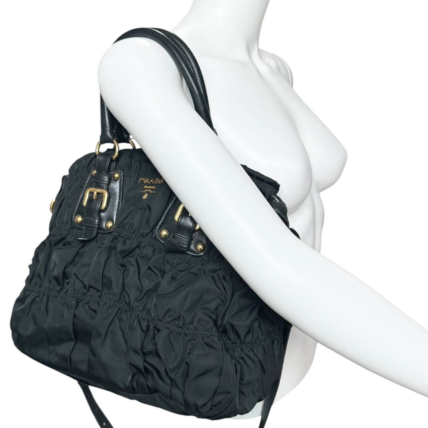 Prada Nylon Ruched 2-Way Hobo Shoulder Bag in Black / Gold